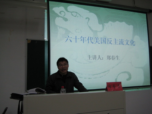 讲座中,为了使同学们对反主流文化有一个客观全面的了解,郑春生老师生动形象地通过摇滚乐、精神之恋、性解放和群居公社四方面对60年代美国反主流文化作了细致的讲述。接着,郑老师又从理论和历史两个因素对"六十年代美国青年反叛"作了深入的探析。理论因素从心理生物学理论、结构功能主义与大众多元两方面分析;历史因素从战后西方社会转型、美国社会问题、教育大发展带来的问题、批判精神氛、媒体的作用、青年思想和心理因素六个方面作了分析。讲座最后,郑老师深刻地反思了六十年代美国反主流文化。