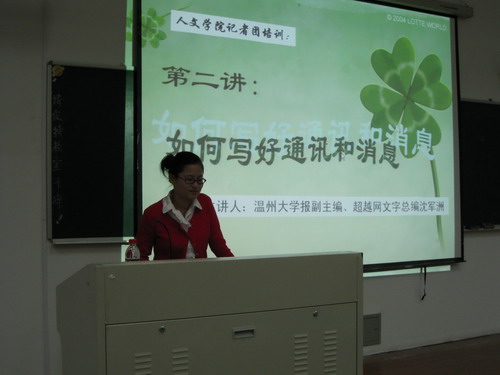 2008年11月8日晚7:00,德赢ac米兰官方合作vwin记者团培训第二讲"如何写好通讯和消息",在德赢ac米兰官方合作vwin1-101教室举行。本次讲座由《德赢ac米兰官方合作vwin报》副主编、超越网文字总编沈军洲主讲。