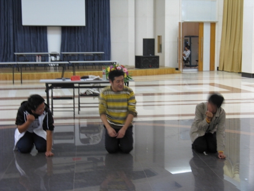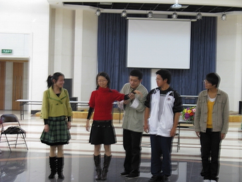 第二部分是由牟老师对一些报名参加话剧表演大赛的剧组进行现场指导。这一部分是整场讲座的高潮,得到了全场同学们的热情支持。刚一开始,就有6位同学自告奋勇上台参与了表演基本技巧的现场训练,牟老师亲自示范了“放松与紧张”、“脸部表情变换”和“模仿技巧”等动作,他高超的表演技巧给了同学们不小的震撼,得到了大家热烈的掌声。然后,几支参赛队伍纷纷上台表演了平时排练过程中较难把握的话剧片段,牟老师在仔细观看后,从舞台分布、台词、表情、动作等各个角度进行了认真分析,给予了各剧组很多专业的指导和中肯的意见。