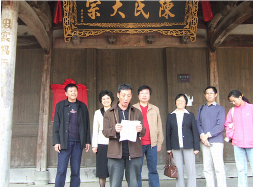 仪式在芙蓉村“陈氏大宗”祠庙前进行。上午十点,由永嘉岩头镇人大李副主任主持仪式;芙蓉村村委会主任陈继仁代表芙蓉村村民热烈欢迎温大师生的到来,感谢温大民俗学对发掘芙蓉古村落的非物质文化遗产的研究工作;同时介绍了芙蓉村的经济文化、旅游事业的发展现状。德赢ac米兰官方合作vwin民俗学研究所负责人、硕士生导师邱国珍教授发表讲话,阐明设立民俗学教学研究基地的意义及芙蓉古村落独特的民俗学研究价值。岩头镇人大主任戴小明和邱国珍教授共同揭牌,“德赢ac米兰官方合作vwin民俗学教学研究基地”的牌子挂于芙蓉村“陈氏大宗”祠庙大门上。
