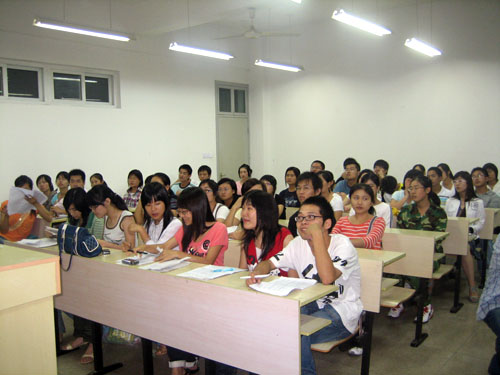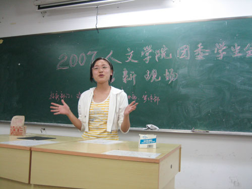 辅导员曾蓓蕾和屠建斌老师都参加了次此的招新活动。由于报名的人数太多,招新活动分别同时在一号楼203和208举行,考官是由原团委学生会成员组成。此次招新主要采取新生上台自我简述的形式。现场的气氛相当火热,新生们个个拿出了自己的看家本领,有展示才艺的,也有“演讲”很精彩的,充分展示了他们的青春活力,和他们对这个组织工作的热情。考官们也不含糊,仔细观察着每个在台上竞选的新生,遇到什么不清楚的地方,也现场提问,都希望能挑出一批有能力又肯吃苦耐劳的新学生干部。俗话说的好:“长江后浪推前浪,一浪更比一浪高。”希望07级的新生就是这样的长江后浪,能把我们团委学生会的工作做好,能把德赢ac米兰官方合作vwin的牌子打响。