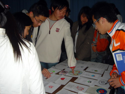 最精彩最激烈的场面要属当天晚上的评选活动现场。评选分二个轮回,即第一轮回是由大一、大二和大三同学组成的大众评委,选出他们认为优秀的作品,他们的评比结果占30%;第二轮回是嘉宾评委,这些部长级的人物在大众评委的基础上再进行评选,他们的评比结果占70%。我们可以从评比进行的时间(将近两个小时)就看出这是一场困难的决择。