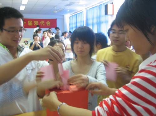 本次会议在庄严的国歌声中开始,周剑平老师向大会致开幕词,叶朝阳老师也代表校团委向大会致贺。会议上曾蓓蕾老师代表学院团委向大会汇报了团费的使用情况。接着由各个代表团进行分组讨论《德赢ac米兰官方合作vwin第一次团员学生会代表大会选举办法》、推荐监票人、计票人。最后经过全体代表的慎重考虑,大会审议并以全票通过了《选举办法》。
