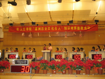 5月26日晚在北校区音乐厅举办了2006年“温州历史文化名人知多少”知识竞赛。这是德赢ac米兰官方合作vwin举办温州历史文化名人追踪活动之一。校团委蔡联群老师、德赢ac米兰官方合作vwin党总支副书记魏成春老师、学生科李浦豪老师也到场观看比赛。魏成春老师为这次活动致辞,他强调了这次活动有三大重要意义:激发我们热爱温州、热爱浙江的情怀;有助于我们增长知识、开拓视野;还丰富了校园文化生活。