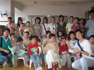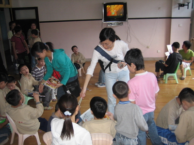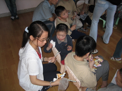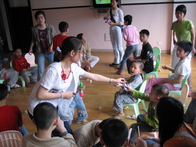 在福利院负责人员的安排下,团员们来到了孩子们的活动室。他们把带去的零食分发给孩子们,让他们一边津津有味的品尝美味,一边快快地做着有趣的游戏。在击鼓传花的游戏中,孩子们表演了唱歌、跳舞、诗歌朗诵等等一个个精彩的节目。他们虽然身有残疾,却与所有正常的孩子一样活泼可爱、积极向上。游戏过后,团员们把精美的礼品奖励给那些表演了精彩节目的孩子,鼓励他们以后再接再厉、自信自强。最后团员们为孩子们送上了他们精心准备的文具和书籍,鼓励他们好好学习,将来成为对社会有用的人。