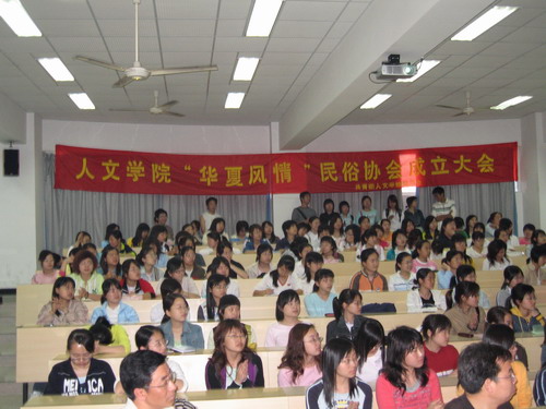 4月12日下午1:00,德赢ac米兰官方合作vwin“华夏风情”民俗协会成立大会在1-203教室隆重召开。“华夏风情”民俗协会是我校最新成立的一个挂靠在德赢ac米兰官方合作vwin之下的一个社团。此次成立大会由会长辛颖同学主持,德赢ac米兰官方合作vwin党总支书记周剑平老师、副书记魏成春老师、民俗协会指导老师邱国珍老师、校团委吴莉娜老师、德赢ac米兰官方合作vwin学生科科长李浦豪老师,辅导员曾蓓蕾老师出席了大会,近300名会员也准时到场。