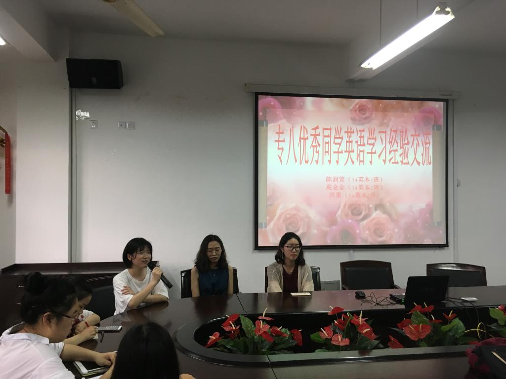 2018年6月19日晚,在外语楼212教室,德赢官网外语系和翻译系举行2018年第8场“外语类专业专四专八辅导讲座”,讲座邀请了德赢官网2018年专八成绩优秀的陈润萱(14英本1班)同学、洪果(14英本2班)同学和高金金(14英本2班)同学与大家交流英语学习经验。会议由外语系主任杨开泛博士主持。