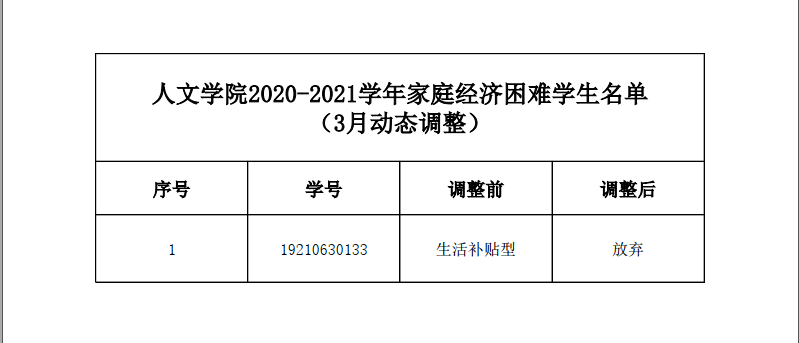 根据《教育部等六部门关于做好家庭经济困难学生认定工作的指导意见》(教财〔2018〕16号)和浙江省教育厅、省财政厅、省民政厅等八部门联合印发《浙江省学生资助对象认定办法》的通知(浙教财〔2020〕15号)、《德赢ac米兰官方合作vwin学生资助管理办法》(温大行政〔2019〕152号)、《德赢ac米兰官方合作vwin家庭经济困难学生认定办法(试行)》的文件精神,经过学生个人申请、学院初审、班级评议、学院学生资助工作领导小组审核认定,现将学院动态调整的认定结果公示如下: