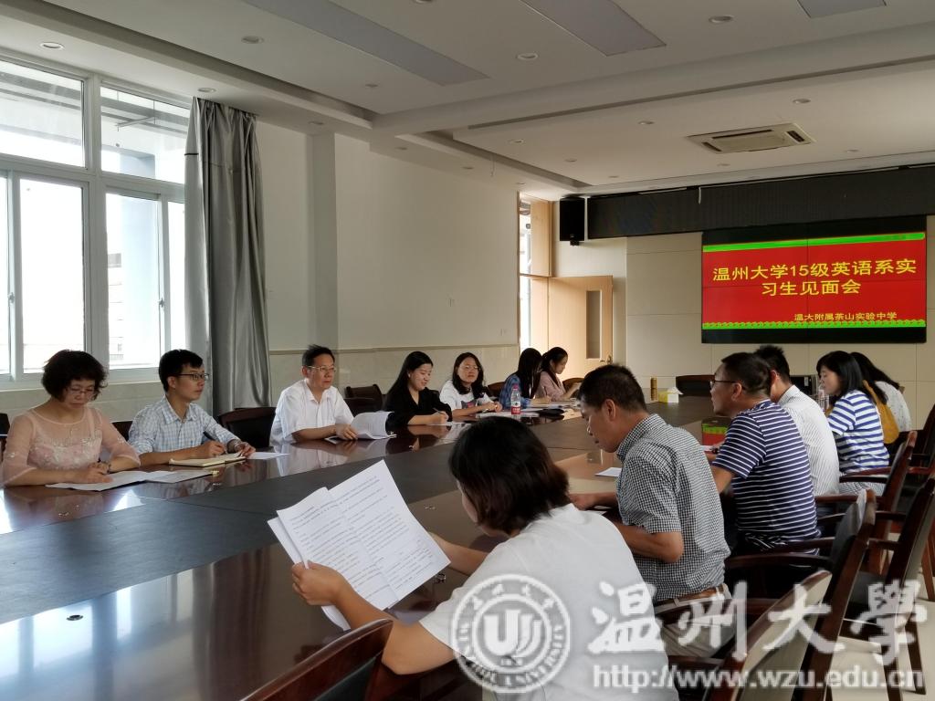 9月28日下午1:00,德赢ac米兰官方合作vwin15级英语系实习生在学院领导毛继光副院长、英语系主任杨开泛老师及实习负责人薛丽芳老师的带领下参加了德赢ac米兰官方合作vwin附属茶山实验中学实习点的见面会。会议伊始,实验中学周龙云副校长发表讲话。周校长对于我校实习生的到来表示隆重欢迎,他向同学们介绍了在座的本次实习中优秀的导师,并对同学们提出了一些要求,希望同学们能尽快熟悉学校,协助老师们管理班级并积极带动学校的学生开展健康有益的活动。