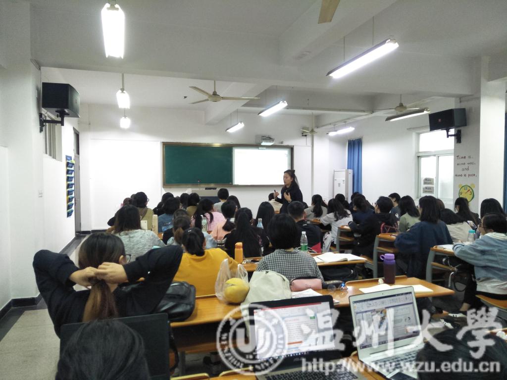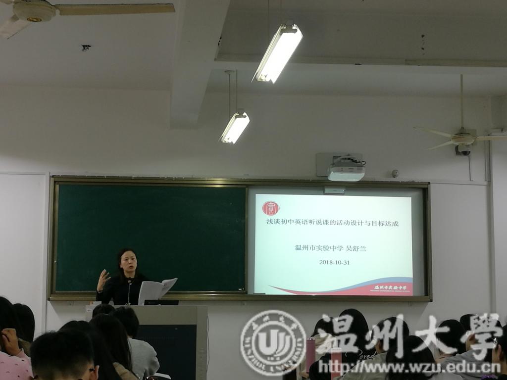 10月31日下午两点,外语楼210教室,德赢ac米兰官方合作vwin邀请温州实验中学的名师吴舒兰为德赢官网16英语师范班举行“浅谈初中英语听说课的活动设计与目标达成”的讲座。吴舒兰老师,曾获浙江省优质课一等奖等多项荣誉。