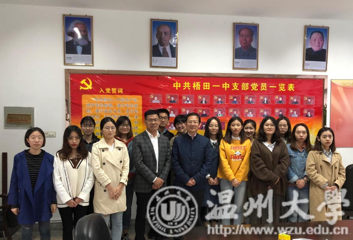 金秋时节,2015级英语师范生赴梧田一中踏上了教育实习之旅!2018年11月2日下午,德赢ac米兰官方合作vwin副院长刘建国、毛继光和指导老师李宋昊前往温州市梧田一中看望15英本(师范)班,并考察了其实习工作。
