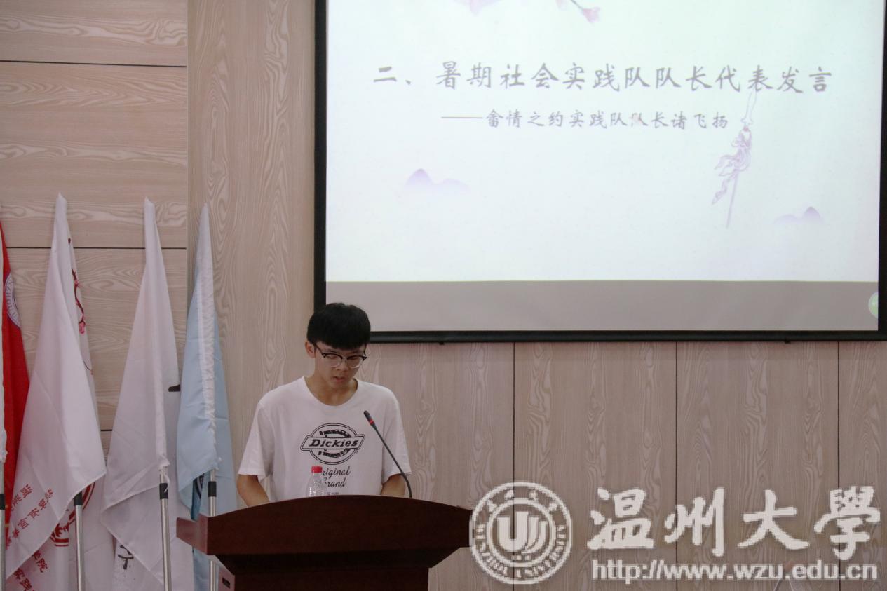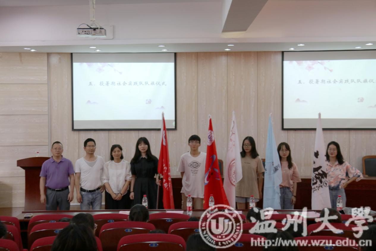 本次出征仪式共有五项流程。首先,是党委副书记魏一老师致辞,指明广大学子积极参与暑期社会实践的目的在于更早地接近社会生活,提前培养起自身的社会适应能力与实践能力,并积极加入到社会的建设中来。同时,魏老师叮嘱同学们在参与社会实践的同时要保障自我的人身安全,一切以队伍整体的安全性为优先考虑。之后,“畲情之约”实践队队长诸飞扬同学作为队长代表上台发言,他向在场的老师和同学保证,将会带领实践队成员积极地加入到暑期社会实践中去,发挥并加强自己的能力,培养实践能力,同时兼顾安全问题,使整个实践过程必有所收获,充满意义。紧接着,第三项流程是由实践队队长代表宣读安全责任承诺书,让同学们更深刻地了解到如何去维护自身安全,增强队伍协作感,打造良好的实践环境。宣读结束后,所有实践队队长上台签署了安全责任承诺书。最后,由全体到场的老师为实践队队长举行授实践队队旗仪式。