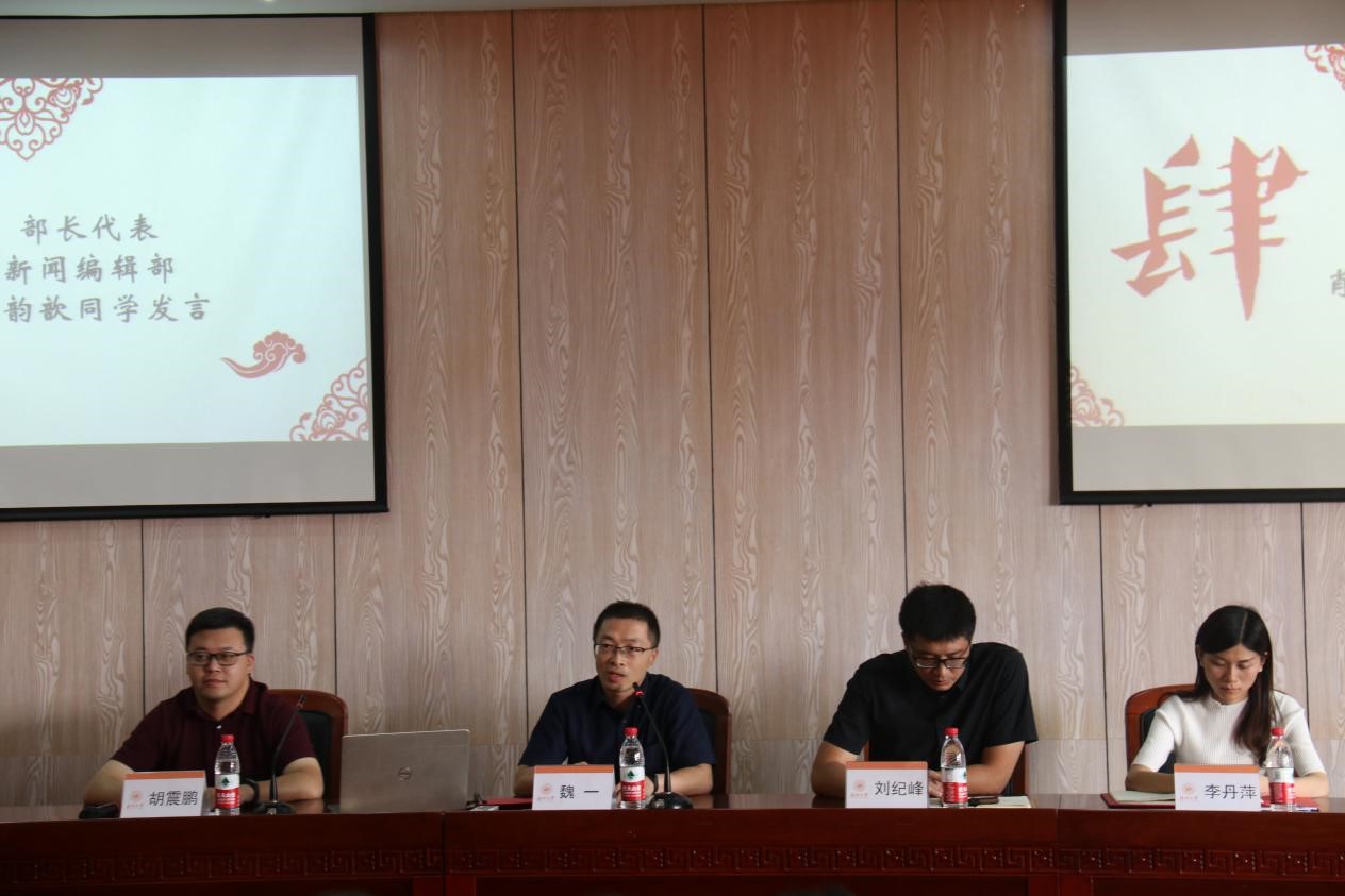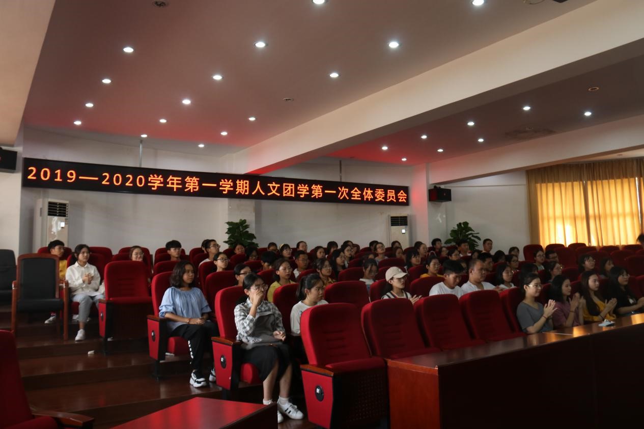大会在激昂的中国共青团团歌中正式开始。学生会主席杜晓月做团学情况介绍,她向大家介绍了团学各部门的职能及近期的工作安排,同时,她也就开学来的团学工作情况提出了自己的建议,并期望新干事们永怀热忱和初心,在人文团学度过最美好的时光。之后,文体部干事孔佳妮发言,她代表团学全体新干事表达了他们对老师、学长学姐的感谢并希望能尽自己所能为团学服务。新闻编辑部副部长肖韵歆代表各部门部长向新干事们分享了在团学工作一年多来的心得和经验,希望新干事可以端正态度、相互帮助。随后,院党委副书记魏一老师发表重要讲话,他首先祝贺新干事们顺利加入了人文团学这个大家庭,并坚信团学在深化改革的背景下能做得越来越好。借此机会,魏书记向全体团学成员提出三点要求:一是找准定位,学业与工作两者不可偏,学生干部作为学生,学习是主业,是本分,要先把学业做好,再去干事;二是守住初心,时刻牢记加入团学的初衷;三是要有标杆意识,魏书记强调,不想当将军的士兵不是好士兵,要更高的要求自己,每个细节过程都是成长的机会。最后,魏书记告诉同学们要不懈努力,不辜负老师的信任,不辜负自己独一无二的青春。