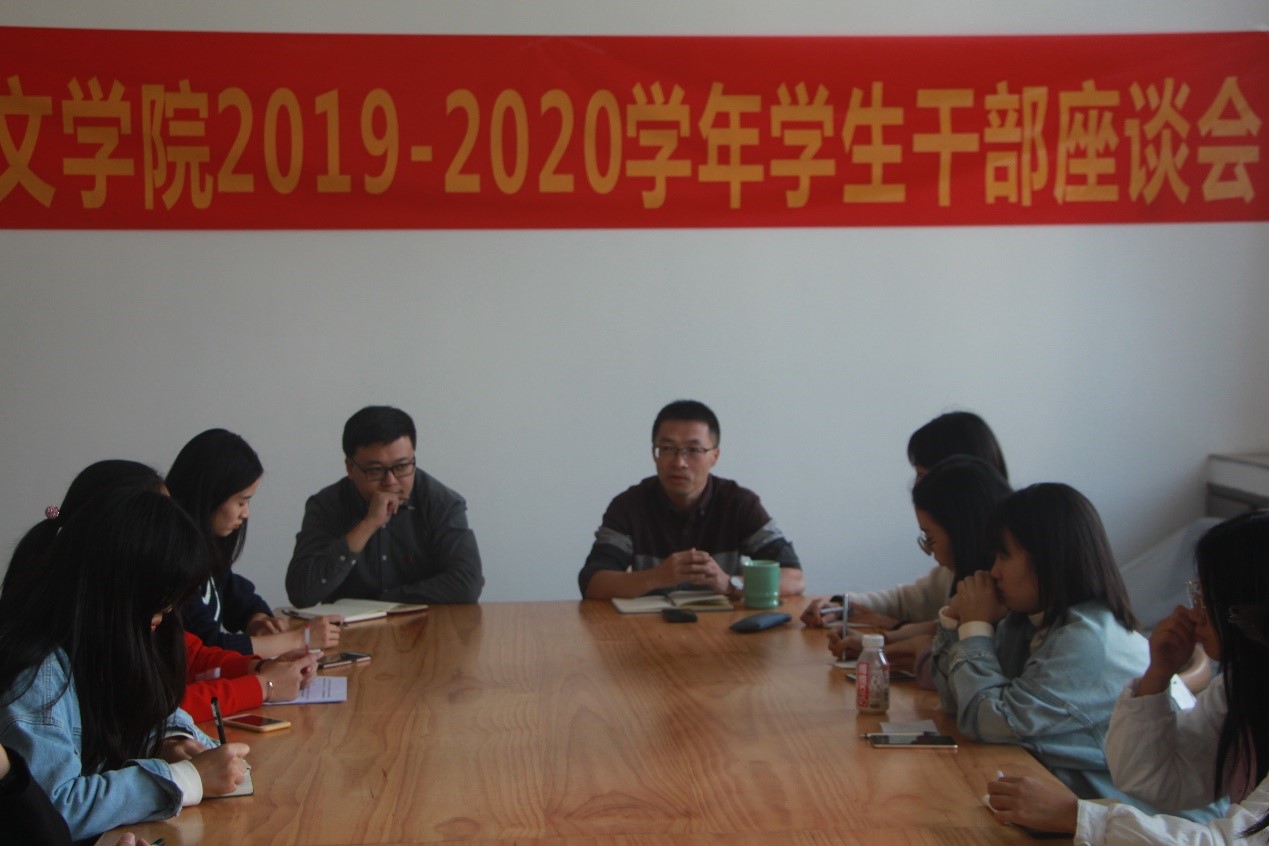 2019年11月6日下午,德赢官网于人文楼214会议室召开了2019-2020学年第一学期学生干部座谈会。出席本次会议的有德赢官网党委副书记魏一老师,学工办辅导员胡震鹏老师,院团学主席团、各部门部长及干事代表。