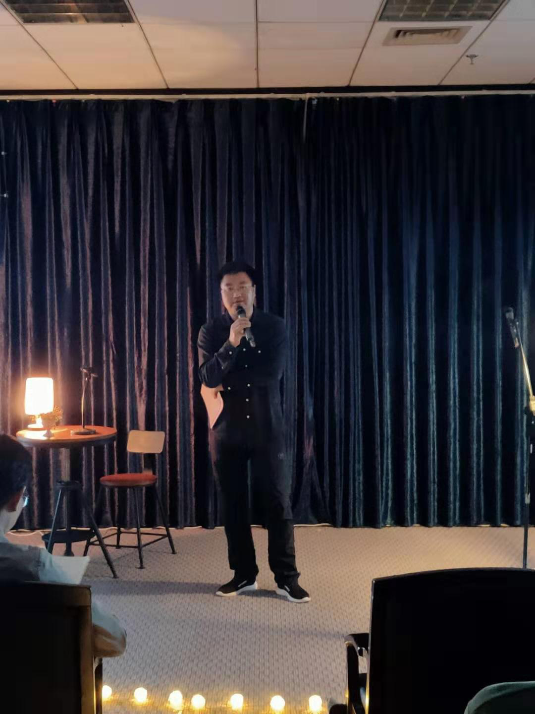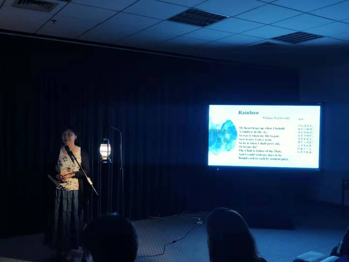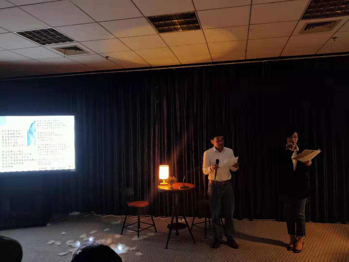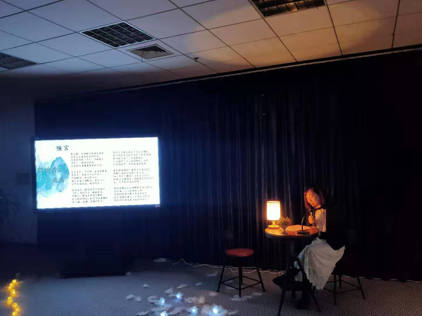 昏黄的灯光,一张书桌,两把椅子,为今晚的诗歌朗诵会营造了读诗的氛围,在这浓浓的诗歌氛围下,伴着舒缓的音乐声,老师和同学相继站到了舞台上,带着满心的热情,向同学们分享了他们精心挑选的诗歌。诗歌中表现出来的对未来、对爱情、对自然的热爱与渴望深深地打动了坐在台下的同学们,他们认真地聆听台上的朗诵,听他们讲述一个又一个诗歌背后动人的故事。文学的美通过语言、通过文字传递给台下的同学,文学无国界,无论是中文还是英文都充分地向同学们展示了诗歌的美好和文学的魅力。