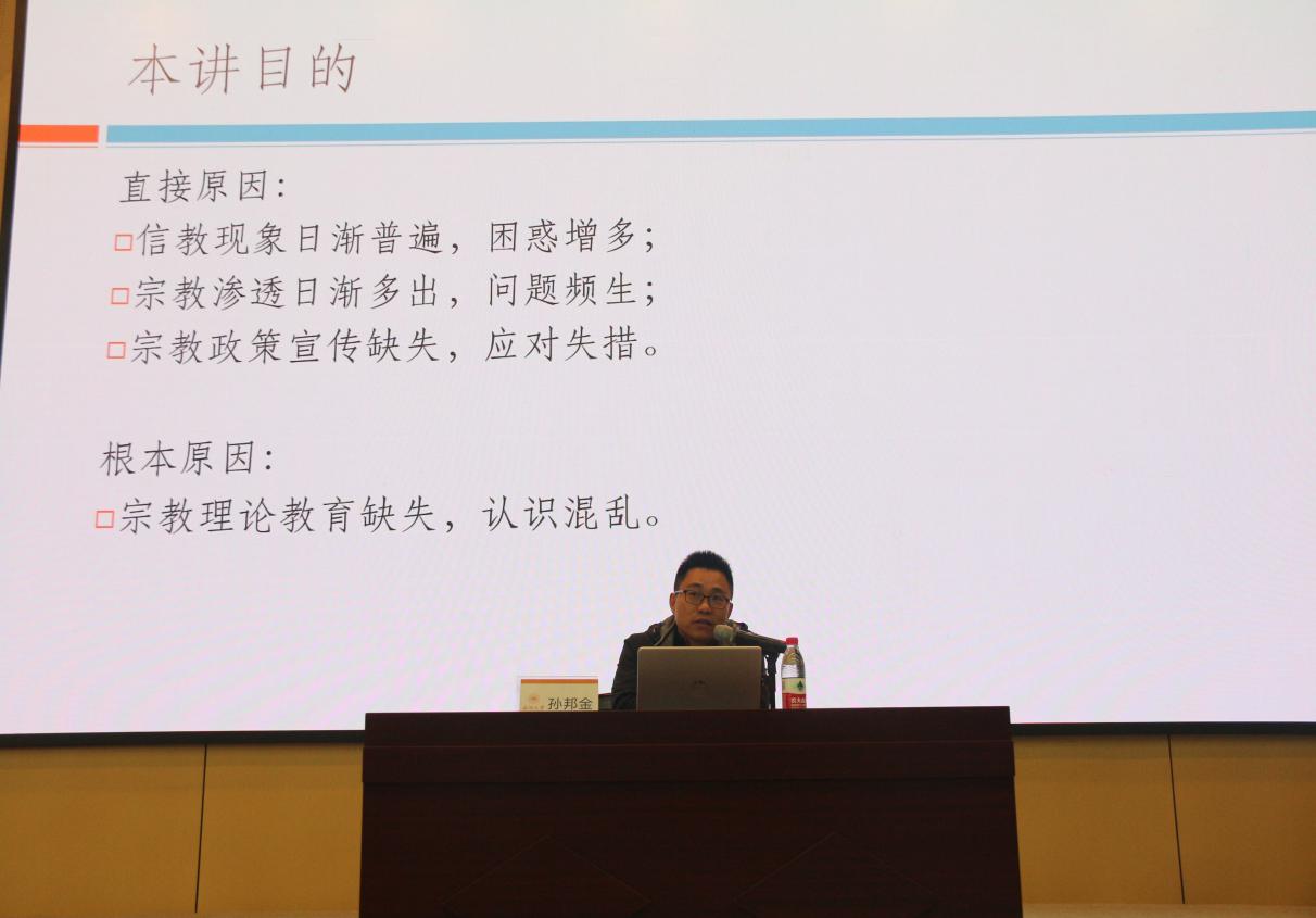 “要坚持宗教中国化方向,对教规教义作出符合当代中国发展进步要求、符合中华优秀传统文化的阐释”,孙教授指出宗教必须服从政治的引导,为政治服务。同时,他强调我国始终坚持宗教与教育相分离的原则,告诫同学们应做到“两个维护,四个反对”。