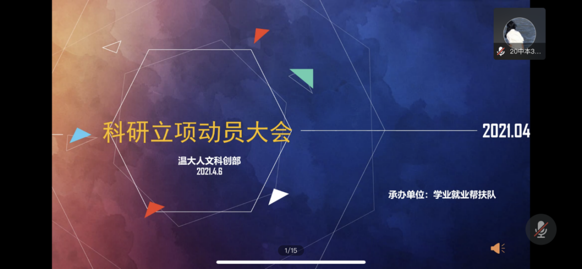 4月6日晚18:30,德赢官网2021年科研立项动员大会在线上进行。学院辅导员申业磊老师及部分同学参加。