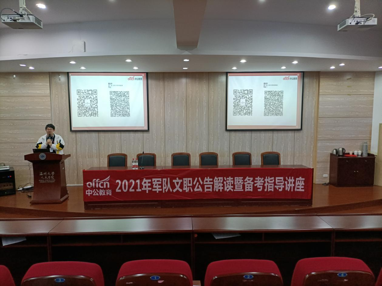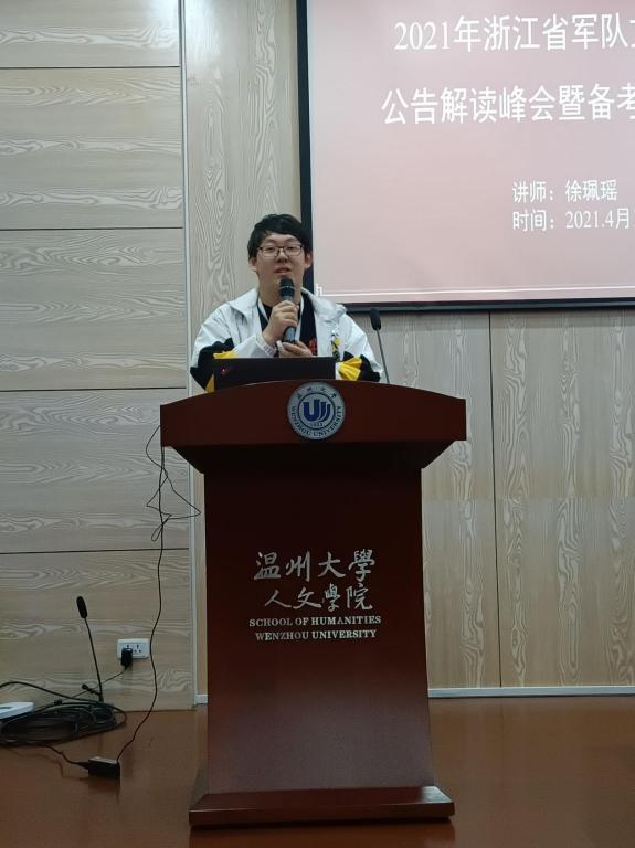 2021年4月10日19点30分,浙江省军队文职考试成绩公告解读峰会暨备考指导讲座在德赢官网人文楼203报告厅如期举行。本次主讲人徐佩瑶老师,从走进文职、招考政策、报考指导、备考指导四个方面深入介绍了军队文职岗位的相关信息,让同学们对其有了一定的了解和认识。