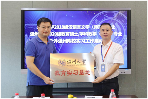 参加见面会的有北京外国语大学温州附属学校的庄振海总校长、中学部翁曦校长、薛承豹副校长、叶德权副校长、赵海荣副校长等领导,王红、陈忠富、郑海燕等指导教师,德赢ac米兰官方合作vwin院长孙良好老师、中文系副主任鲍良兵老师、学科教学(语文)硕士点负责人陈柳老师,以及即将在这里开始实习的15名实习生。