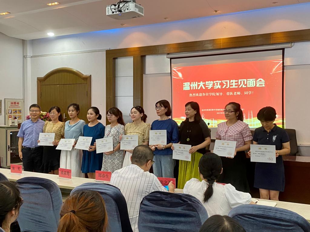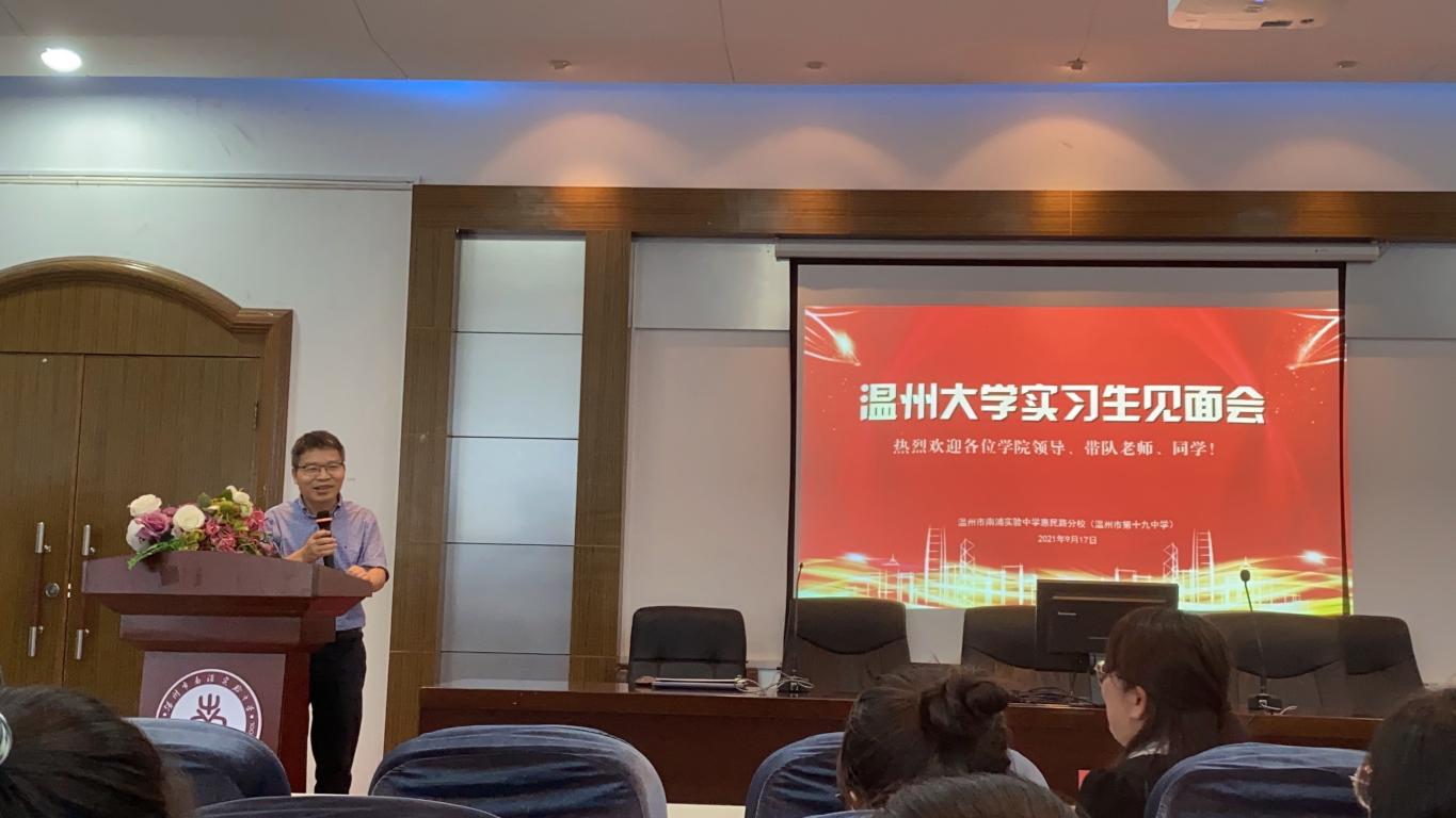 18汉语言文学(师范)实习生见面会于2021年9月17日中午12点20分在温州市南浦实验中学惠民路分校一楼阶梯教室举行。本次见面会的与会人员有温州市南浦实验中学惠民路分校欧素鸯校长、林英副校长,温州市南浦实验中学惠民路分校八年级语文学科教学指导师及班主任指导师,德赢ac米兰官方合作vwin副院长郑春生和实习指导老师洪之渊老师、余琼老师,以及德赢ac米兰官方合作vwin2018级汉语言文学(师范)专业的21名实习学生。本次见面会由金宁宁老师进行主持。