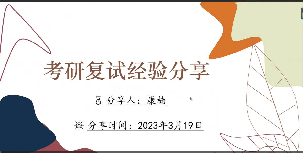 肖心蕊学姐主要分享了关于调剂复试的心得。“调剂是一场信息战”,信息搜集在调剂院校中是非常重要的。同时,专业知识的准备也会影响到面试的结果,因此她建议大家多多准备毕业论文、专业书籍方面的提问。