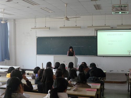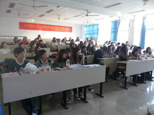 2012年11月19日下午3时30分,德赢ac米兰官方合作vwin学习标兵及优秀学风班评比活动在北校区人文楼201教室举行。德赢ac米兰官方合作vwin教学科副科长伍海燕老师,学生辅导员曾蓓蕾老师,缪凯乐老师和德赢ac米兰官方合作vwin古代汉语教室陈源源老师担任本次评委。参与学习标兵评选的七位候选人,参与优秀学风班评比的班级代表及部分学生观众共同参加了此次活动。