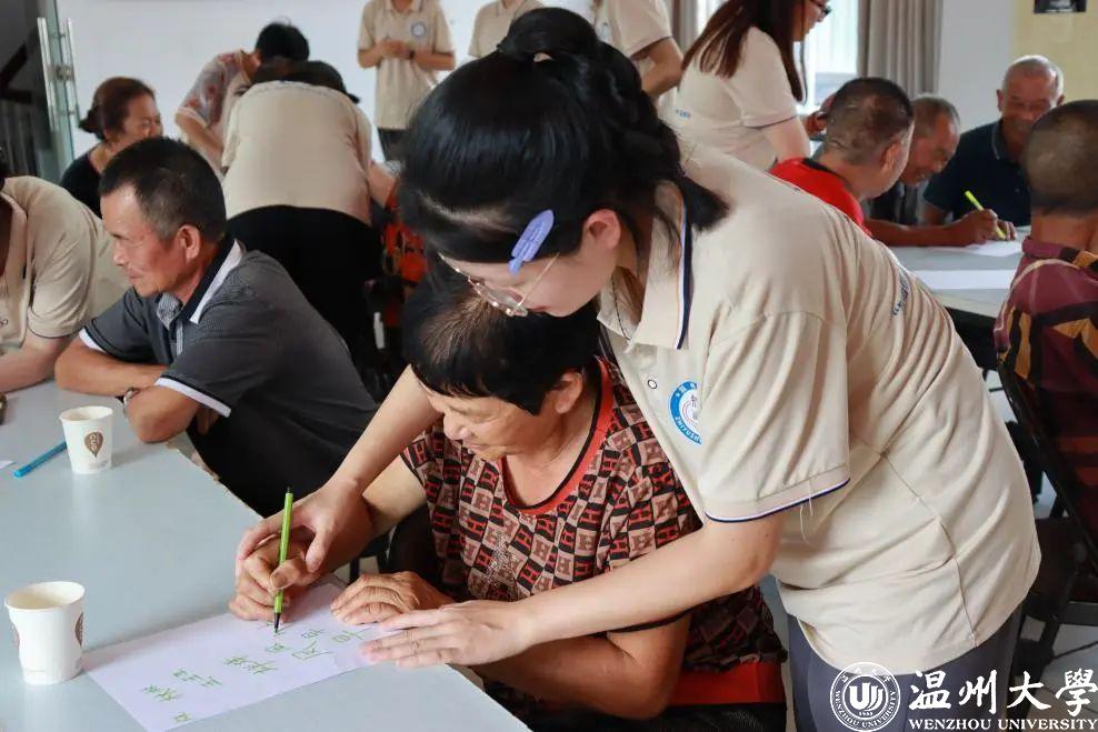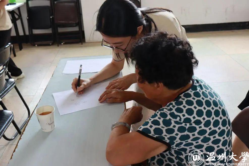 在大家期待的目光中,西斜的日光拉开了活动的序幕。在五凤垟村综合楼的会议室,我们展开了一对一的写字教学。“奶奶好,您的名字是什么呀?”“爷爷,您的字写得真漂亮!”在一言一语的交流间,五凤垟综合楼会议室酝酿着一个温情的午后。尽管有些村民年逾古稀,他们还是用颤颤巍巍的手一笔一划地写下了自己的姓名,他们的坚守与真诚让我们感受到了此次推普活动格外有意义。还有几位不会写字的爷爷奶奶,在得知他们的姓名之后,我们紧握住他们的手,带着他们书写自己和家乡的名字……活动结束时,爷爷奶奶高兴地与自己一笔一划写下的姓名合影,相片中的笑容带着点儿羞涩的满足和自豪。