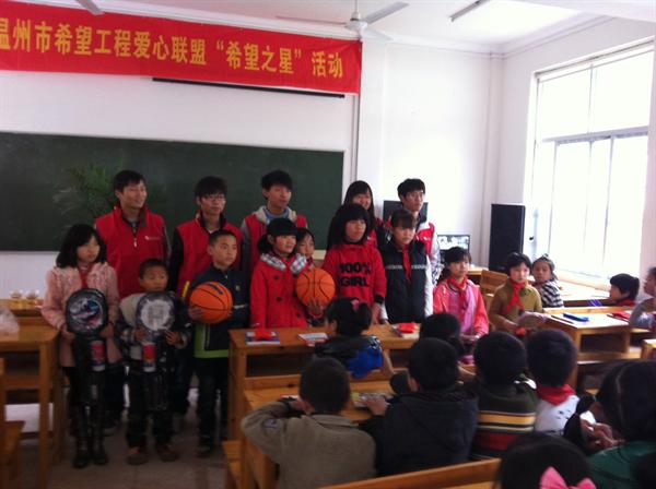 2012年11月24日早上7点30分,德赢ac米兰官方合作vwin思源青年志愿者协会应温州市爱心联盟邀请,与市爱心联盟,德赢ac米兰官方合作vwin商学院青年志愿者协会一同前往了黄南乡中心小学,为那里的孩子们在这个即将来临的冬季传递爱心,带去了我们三方共同购买的捐赠物资。