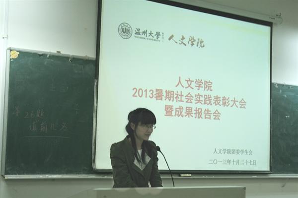 2013年10月27日16点30分,德赢ac米兰官方合作vwin2013年暑期社会实践表彰大会暨成果报告会在人文楼101教室召开。学生科科长曾蓓蕾、主席团各成员、获奖同学以及德赢ac米兰官方合作vwin大一学生参加了此次活动。