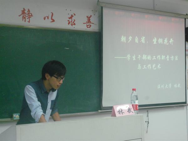 林武学长作为德赢ac米兰官方合作vwin的前团副在团学工作上有极其丰富的经验,他从学生干部的工作职责方法与工作艺术两个方面进行详细讲述。他首先对学生干部这个身份进行剖析,他认为学生干部并不是一个管理者,而应该是一个服务者,接着再是思想引领者。他认为,作为学生干部要培养一专多能:一专——学习好专业知识,多能——处理信息的能力、处理人际关系的能力、系统看待问题的能力以及运用技术的能力。他为各位学生干部定出了一系列目标:组织一系列活动,准备一次主题报告,申报一项学生课题,读100本书,用好100个周末,和不同的同学进行100次谈话,思考100个问题。其次,要练就好的性格,避免性格悲剧,还要训练自己的思维。最后,要重视自己的团队,不要轻易离开自己的团队;要心怀感恩之心,感谢团队给你的平台,不抛弃,不放弃。