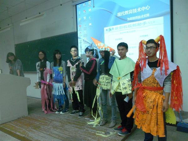 本次活动不同于以往的讲座形式,培训班成员以小组为单位用废旧物制作服装并进行展示。在活动中,同学们表现出了惊人的创造力和想象力。出场的第一小组以“男女搭配,干活不累”为主题,利用报纸、垃圾袋等废旧物品将男士西装与女士婚纱巧妙得结合在了同一件服装中;第二组以“海洋环保”为主题,用废旧海报、塑料袋加之以绘画创制了一身海洋生态服;第三小组以“圣诞、优雅、屌丝”为主题制作了三套服装,充分利用了报纸和卡纸的可塑性;第四小组以小清新为主要路线,以挺括的卡纸加之以粉红色蝴蝶结进行创作。第五小组以“哪吒闹海”为主题,充分利用废弃横幅和纸杯为模特量身打造了一身造型独特的哪吒装。最后经过拉票和投票环节,第一小组和第五小组获得了最多的支持。