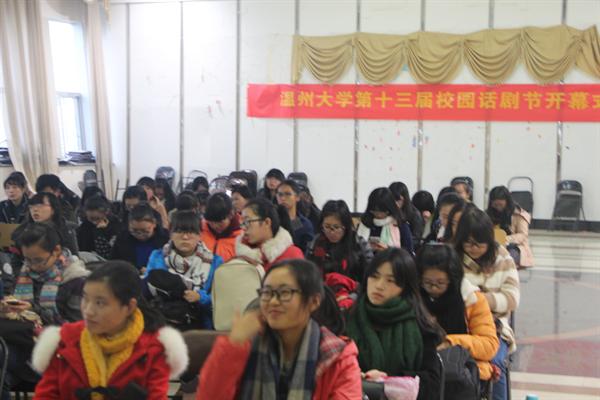 2014年12月3日15点半,德赢ac米兰官方合作vwin第十三届校园话剧节开幕式暨话剧沙龙活动在大学生活动中心A座301多功能厅隆重举行。德赢ac米兰官方合作vwin学生科科长曾蓓蕾、德赢ac米兰官方合作vwin校团委艺术团指导老师胡震鹏、温州市读书话剧社成员及来自近百位校园话剧社的同学出席本次活动。