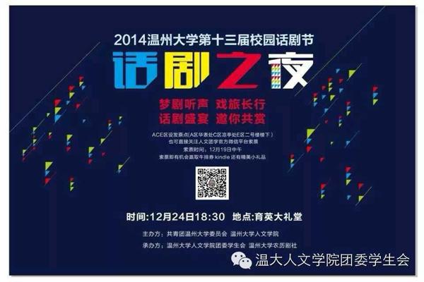 2014年12月24日18:30,"梦剧听声,戏旅长行"德赢ac米兰官方合作vwin第十三届校园话剧节话剧之夜在育英大礼堂正式开演。此次活动由共青团德赢ac米兰官方合作vwin委员会、德赢ac米兰官方合作vwin主办,德赢ac米兰官方合作vwin团委学生会和德赢ac米兰官方合作vwin农历剧社承办。院党总支书记吴静,院副院长孙良好,校团委陈莹老师等和到场的同学们共同享受了一场视听盛宴。