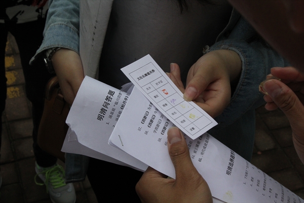 本次“文化长廊”活动以答题闯关的形式开展。每位参与者领取一张通关券,按照通关券上的说明选择闯关顺序,通关即可获得印章。活动内容根据历史时期分成五个关卡,即秦汉、隋唐、宋元、明清、采繁(现代诗歌)。每一关的内容和难度都不同,包括名人轶事、诗词曲赋填空、历史常识、生活、习俗等。闯关者全部闯关成功并集齐5个印章即可获得相应的奖品。同时还有现场抽奖和签名留念的活动,吸引了大量的同学。