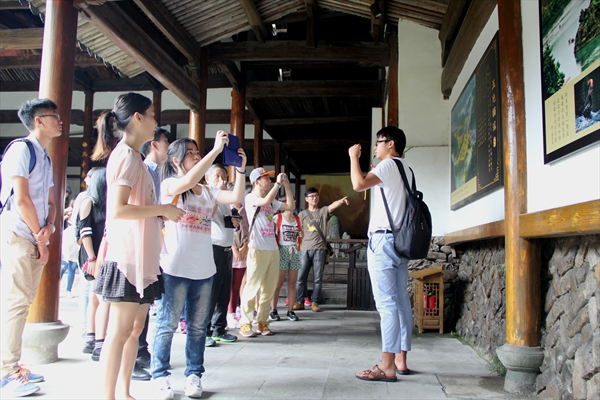第一站的目的地是丽水古街,作为楠溪江流域的著名景点之一,。学员们一下车便为当地的美景所吸引,山峰崔巍,旻天如染,古构井然,各个角度看去,都仿佛是一幅美丽的花卷。淳朴的老农倚靠在走廊上,烂漫的孩童嬉闹于水畔,群山环绕间,俨然遗世独立的世外桃源。同学们被当地环境深深吸引,心灵已似受到净化一般,更加的澄澈开明。德赢官网学办、文化创意学硕士生肖倩倩同学表示此地山水娴美令人流连忘返,附近又有如许出色的文化创意项目,对大家学习帮助非常大。丽水街的参观结束,同学们在街口农家乐用了午餐,便前往下一站——永嘉书院。