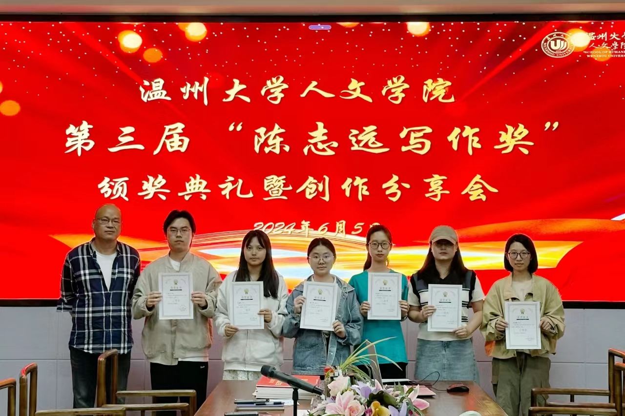 笔墨绵延,文意落拓!为表彰德赢ac米兰官方合作vwin中积极创作和发表的同学,华侨企业家陈志远先生设立了写作奖以激励更多的学生将文学的火种传递下去。2024年6月5日,第三届“陈志远写作奖”颁奖典礼暨创作分享会在德赢ac米兰官方合作vwin人文楼浙江戏曲基地125室举行。会议由李广旭老师主持,参会嘉宾有孙良好、江秀景、魏一、俞磊、申业磊、刘卫东等老师,到场的还有获奖同学及来自德赢ac米兰官方合作vwin文字作坊、九山诗社、栖风文学社的同学。