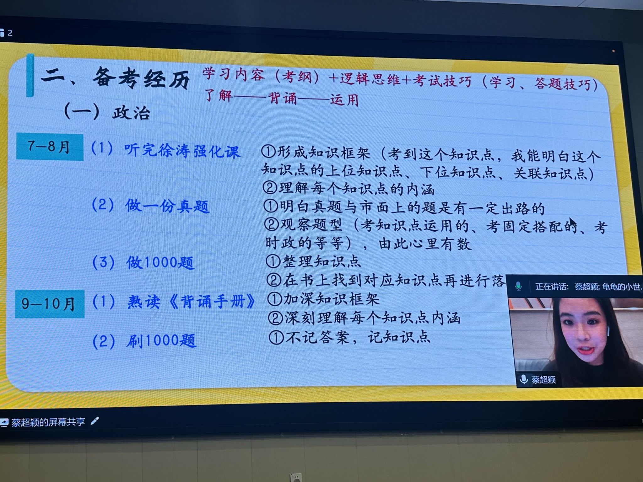 随后在同学们的热烈掌声中,德赢ac米兰官方合作vwin2024届本科毕业生、2024级学科教学(历史)专业研究生蔡超颖学姐通过线上方式,分享她的考研经验。学姐亲切地与同学们交流,仿佛是一位知心的朋友,将自己在考研过程中的点点滴滴娓娓道来。蔡超颖学姐首先分享了考研的学习心态,她说考研是一场持久战,需要有坚定的信念和足够的毅力。接着,学姐详细介绍了自己的备考经历,包括复习计划和方法。她强调了制定合理计划的重要性,并根据自己的实际情况将复习分不同阶段,每个阶段都有明确的目标和任务。学姐的经验分享让同学们深受启发,她的成功经历也让大家看到了希望和榜样的力量。