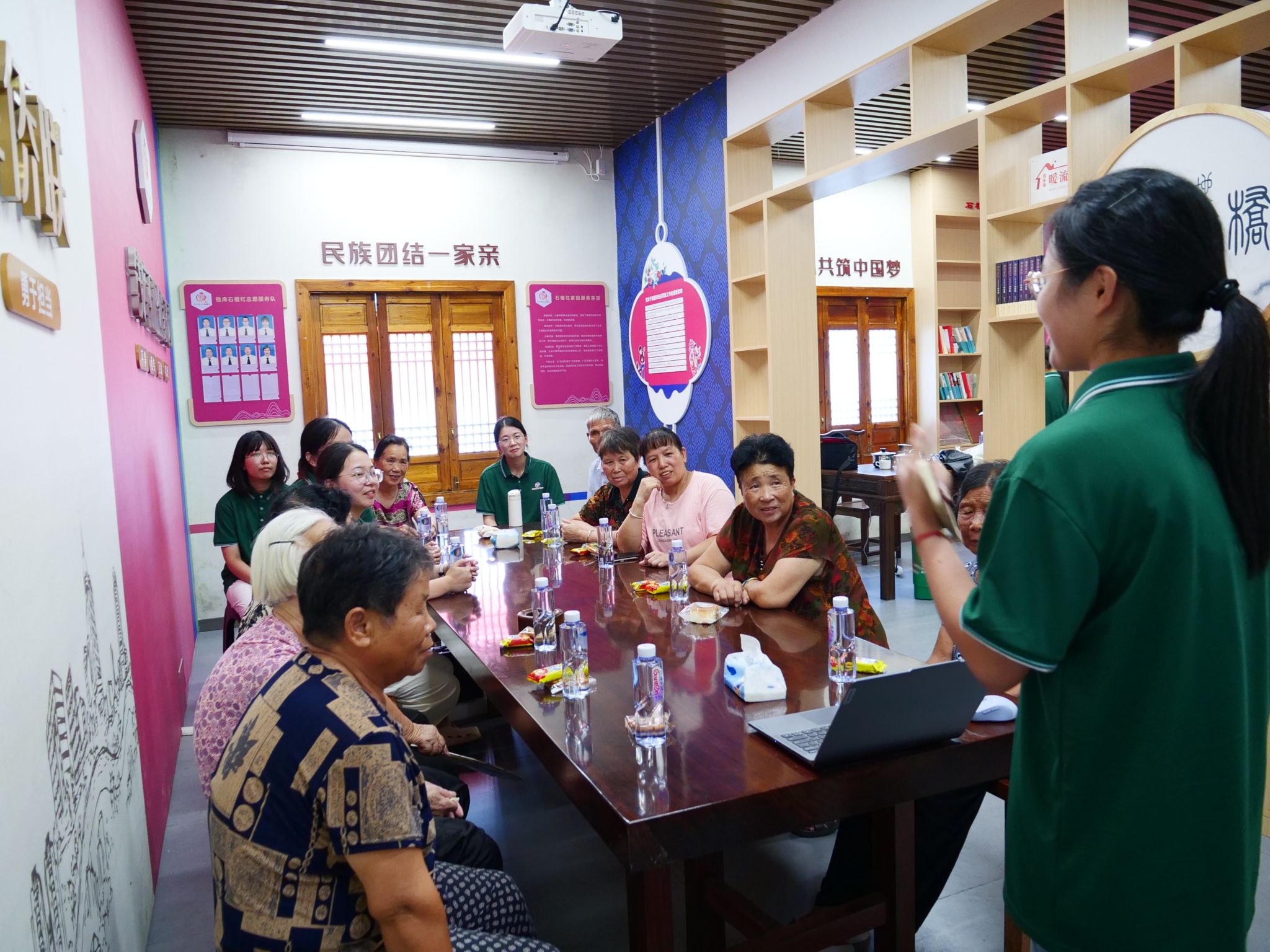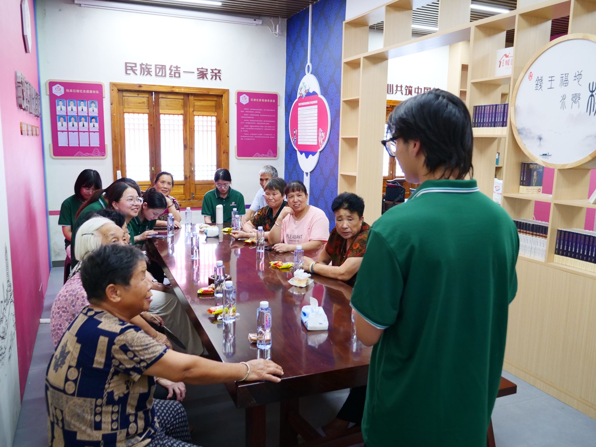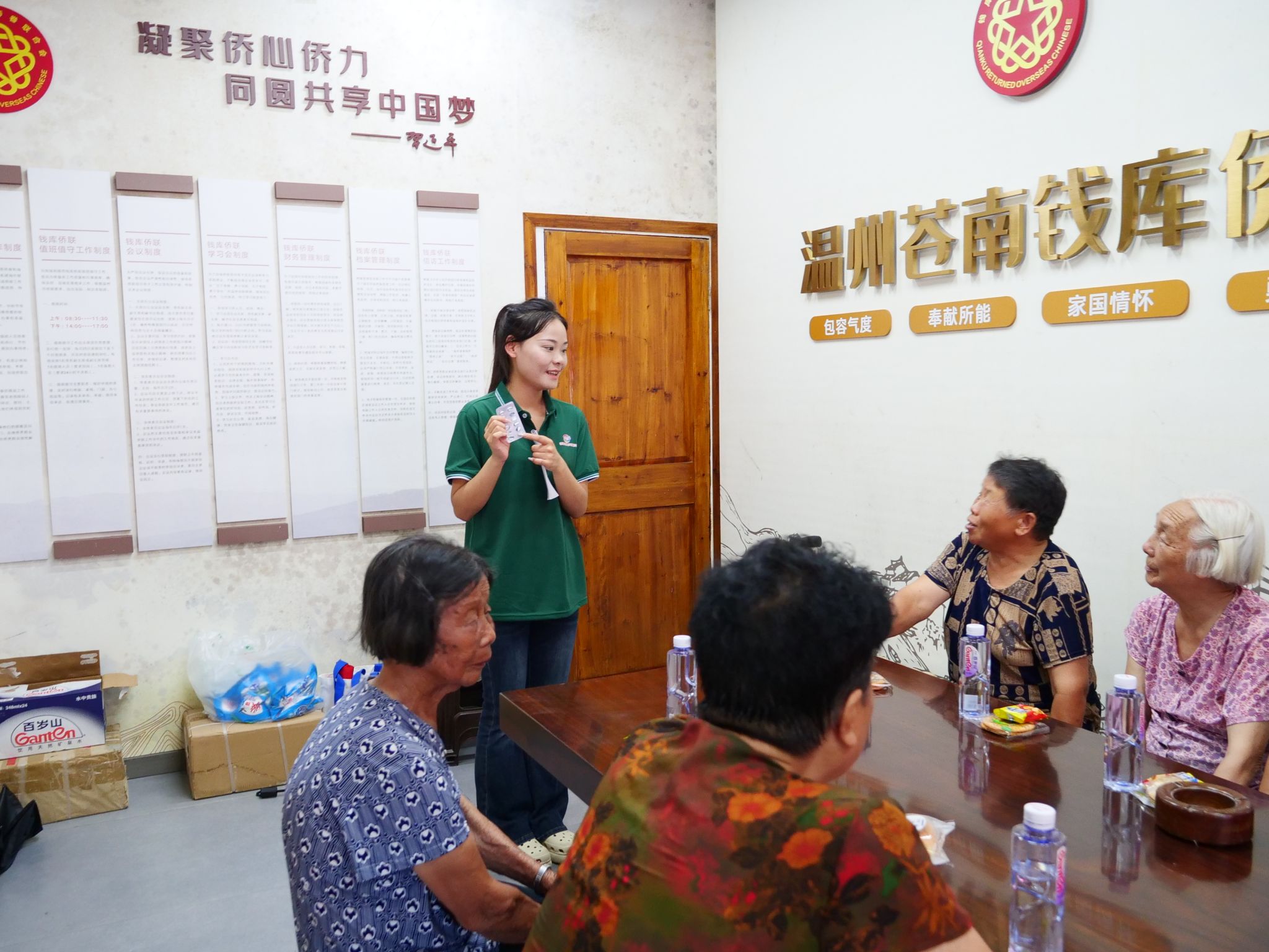推普活动在浓浓的文化氛围中迎来高潮。队员特意选取了项东村武状元项桂发所作的《南雁荡诗》作为教学素材,将普通话推广与当地文化传承巧妙融合。“这句‘树色逢迎如有约’,”队员解释道,“就是说路边的树木都在欢迎我们。”老人们跟随着队员的教导,将武状元的诗句一字一句念出,朗朗的诵读声在文化礼堂内回荡。推普的意义,或许就藏在这代代相传的文化温度里。
