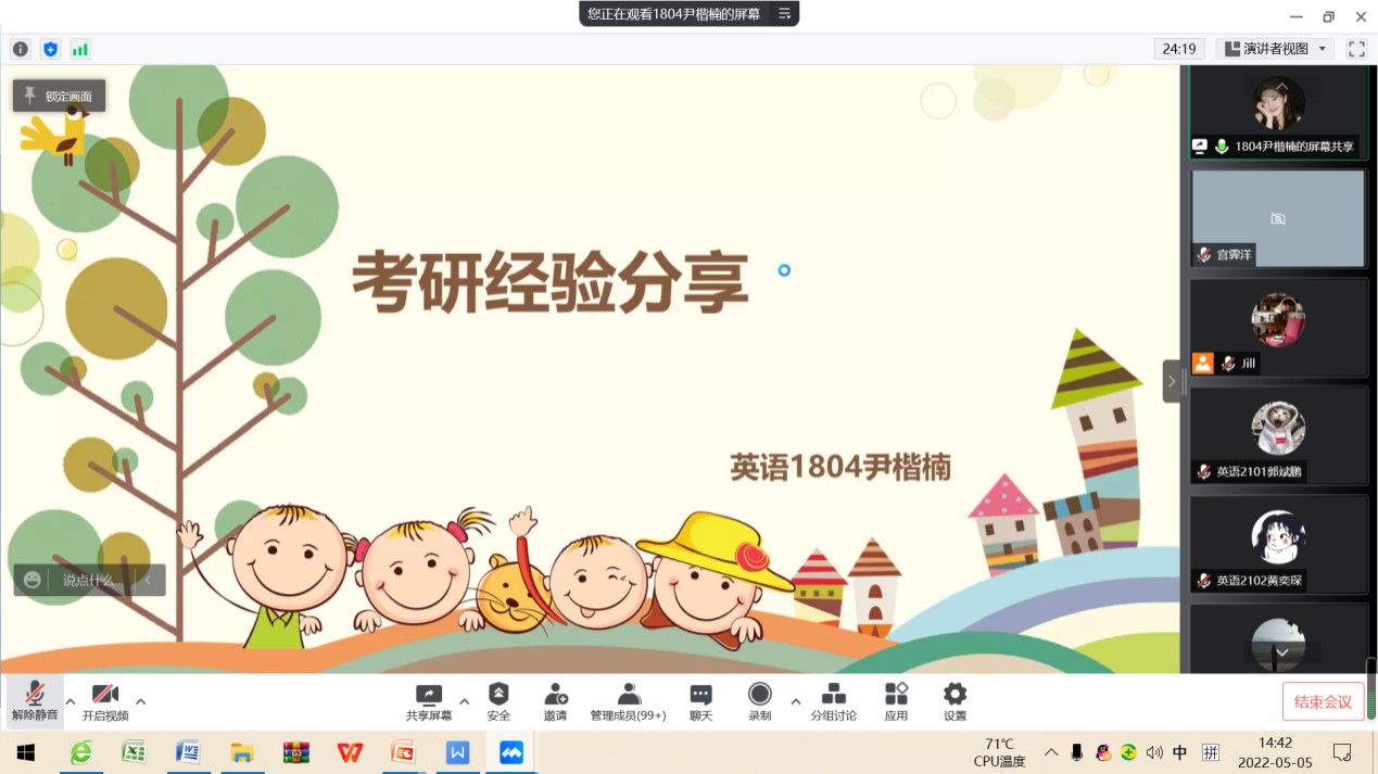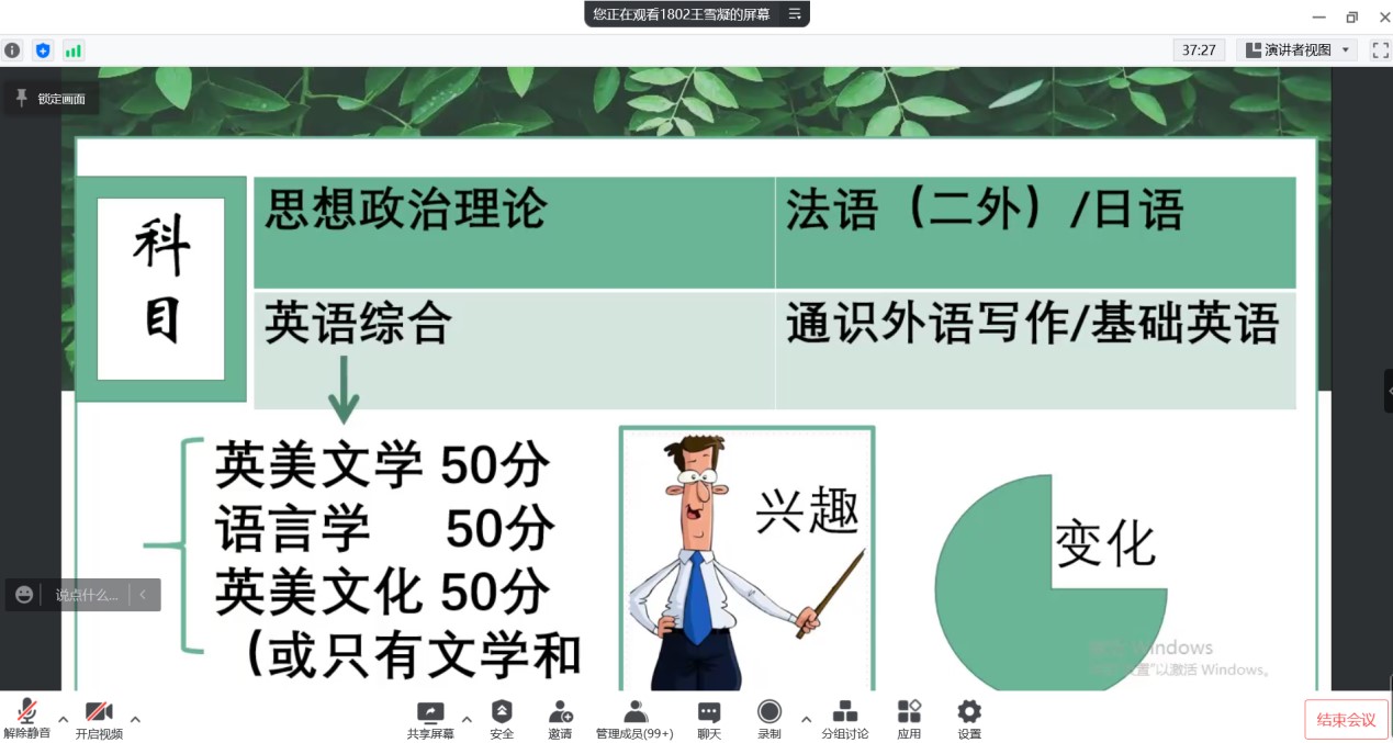 2022年5月5日下午,best365手机版官方网站英语专业通过腾讯会议召开了考研暨就业交流会。会议由教学部主任王静老师主持,邀请2018级9位成功考取硕士研究生以及顺利就业的学生交流心得和分享经验,2019级、2020级以及2021级170余名学生与会交流。学长从选择考研学校和专业、复习备考、调剂学校、就业和备考教资五个方面分享了自己的经验,并鼓励学弟学妹们平时注重知识积累和能力培养。