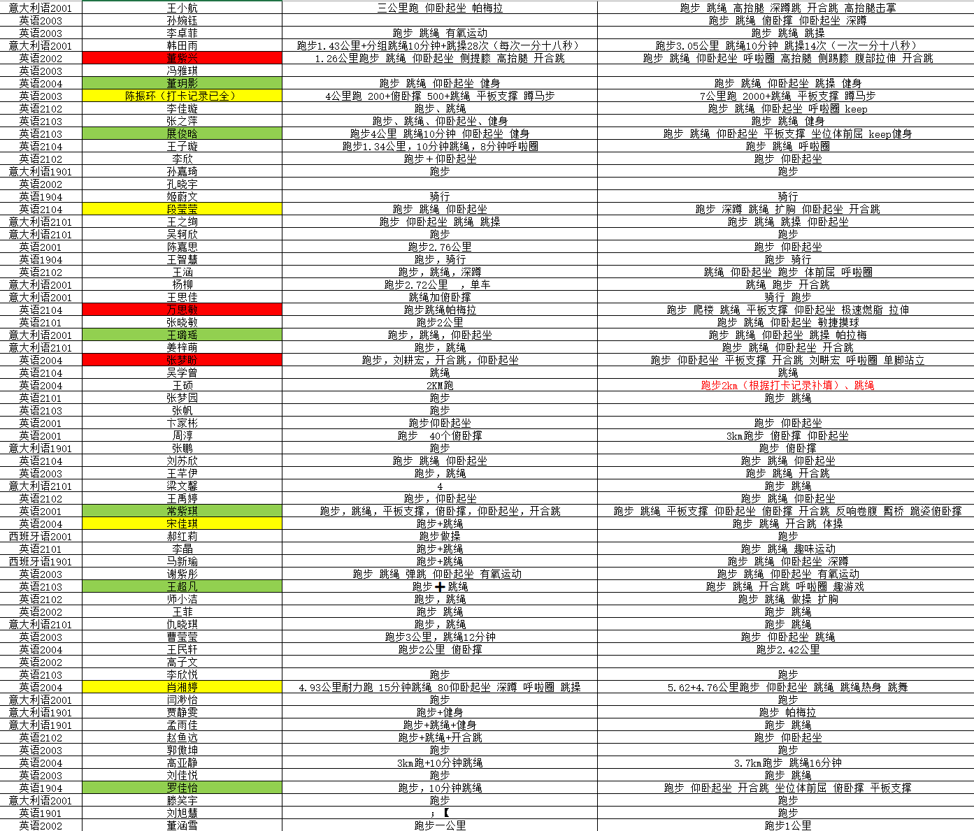 本次活动共有93名同学参加,大家通过在指定小程序中上传图片或视频记录自己为期一周的健身打卡运动。工作人员每天对选手所填打卡项目进行核对与整理,为保证线上活动的公平与公正,还认真校验了选手所上传照片或视频的真实性。最后根据同学们的打卡热情、坚持情况、项目丰富度、运动量及消耗量评出健身成果排名并评奖。在本次活动中,每位同学都展现出了积极的运动热情。