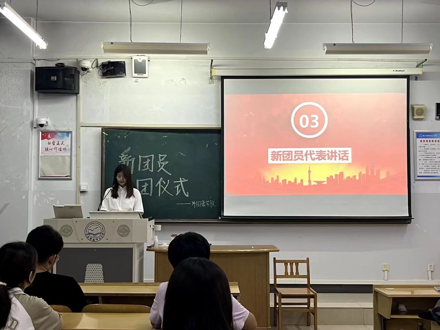 所有入团积极分子全部参与本次新团员入团仪式。伴随着嘹亮的团歌,新团员入团仪式拉开了序幕。“我们应做时代大潮流中的一滴水,为党和国家的发展尽自己的绵薄之力。”这是老团员代表王彬彦奉献家国的青春宣言。新团员代表王祎婧表示“加入共青团,不仅是一份荣誉,更是一份责任。我会在共青团的队伍里不断地锻造、磨砺自己,以自身行动践行对团组织立下的誓言”。最后,新团员代表信宇轩带领全体学生进行入团宣誓。宣誓时,新团员们情绪高昂,精神饱满,体现了新团员们奉献家国、不负组织的坚定信念。
