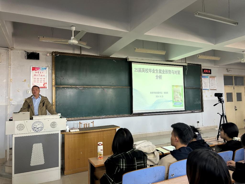 为了让同学们充分了解就业形势,合理规划职业发展路径,2024 年10月23日,best365手机版官方网站邀请教育学院张晓军书记作《25届高校毕业生就业形势与对策分析》专题宣讲会。讲座由best365手机版官方网站党委负责人主持,2021 级及2022级全体在校生300余人聆听了讲座。