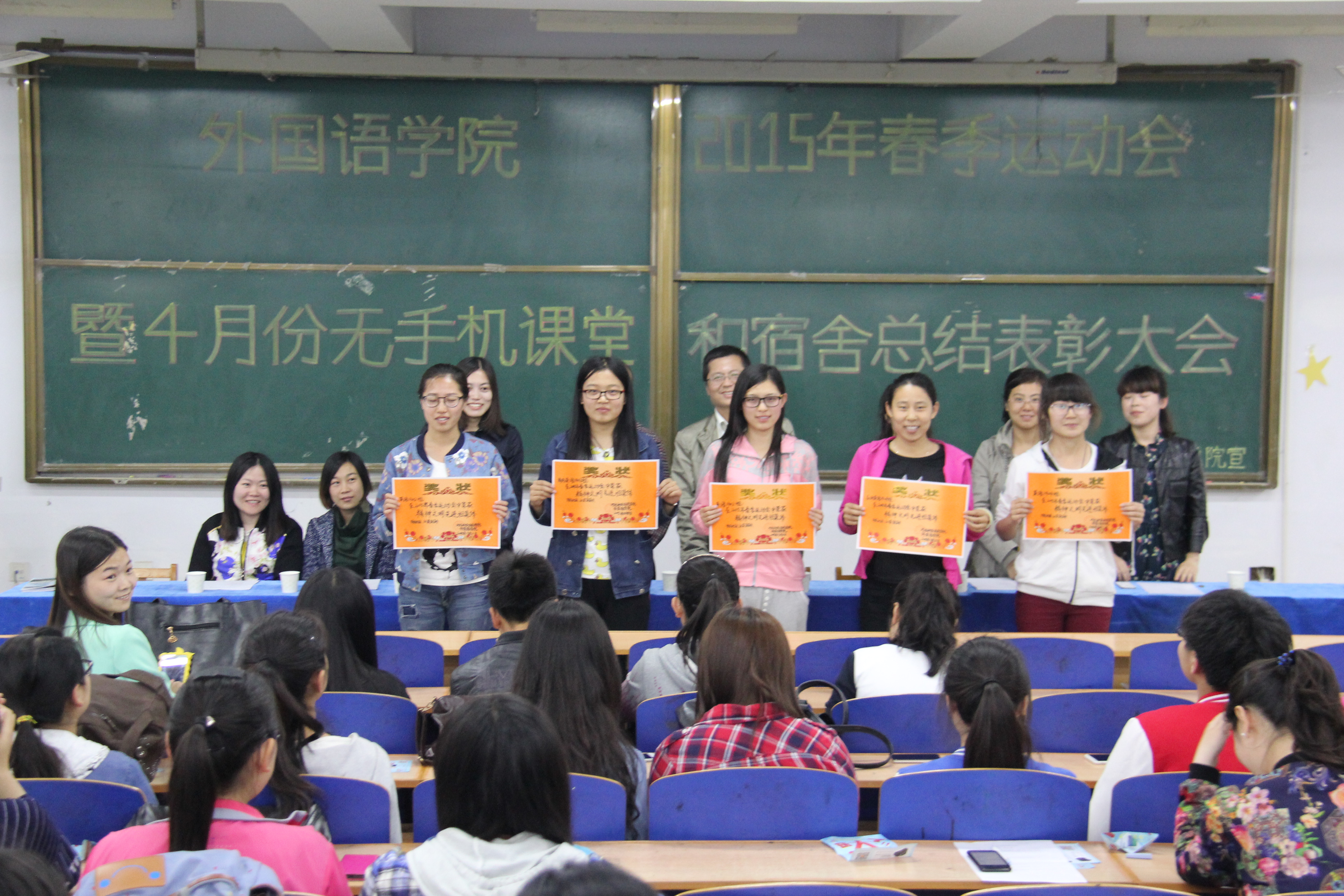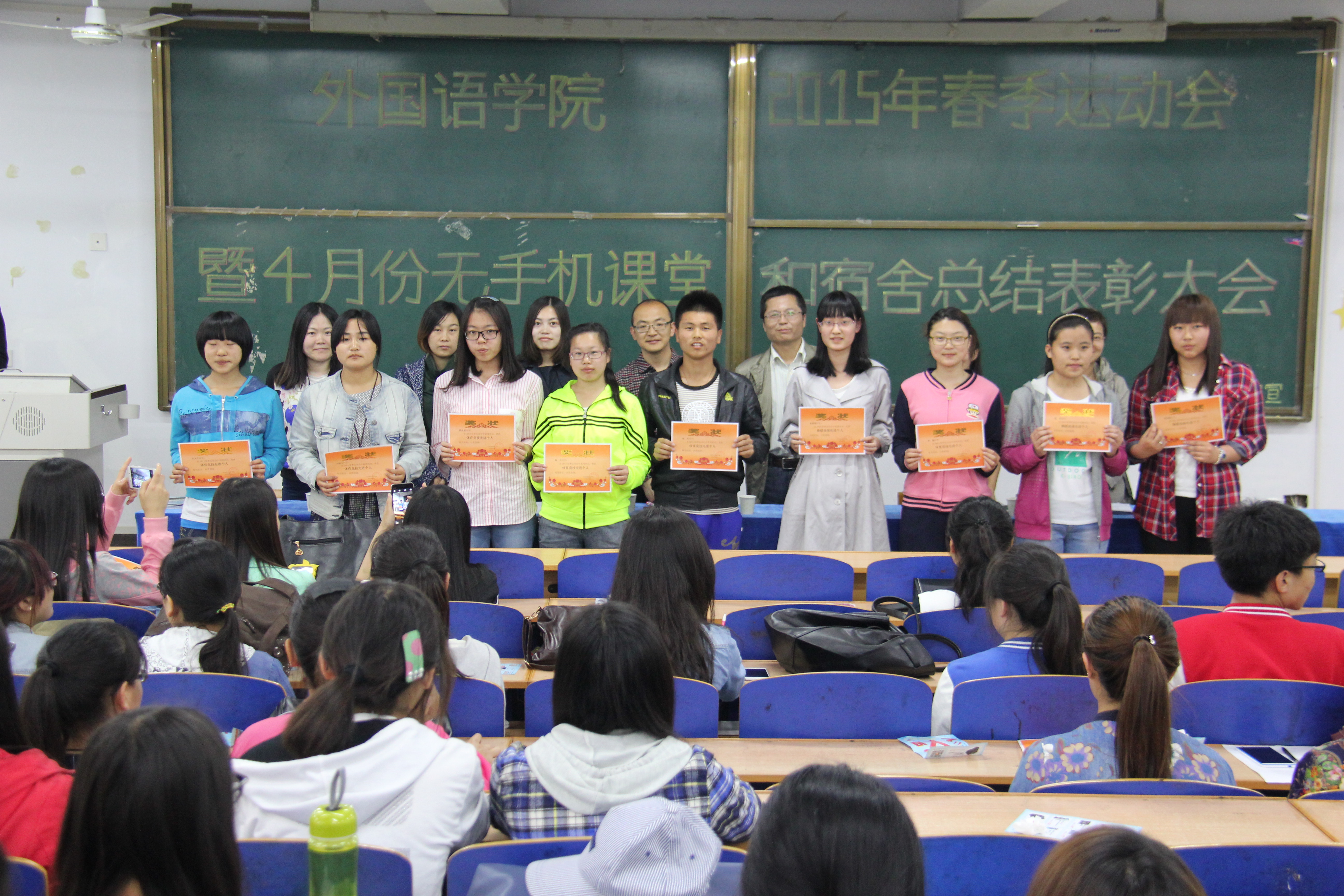2015年best365手机版官方网站春季运动会刚刚落下帷幕,best365手机版官方网站获得运动会精神文明奖。为总结经验,传承运动会拼搏奋斗精神,best365手机版官方网站于5月8日中午在综合楼312教室召开了2015年best365手机版官方网站运动会总结表彰大会。学工办、全体辅导员、学生会全体成员和参加运动会的班委干部和运动员近200多人参加了大会。会上,全体老师们为获得2015年学院精神文明先进班集体、竞技先进班集体和运动会先进个人荣誉称号的集体和个人颁发奖状和证书。在发言中,老师们希望同学们通过运动会锻炼健康体魄,希望同学们发扬运动会团结一心,拼搏向上的精神,并在以后的学习工作中继续努力,取得更加优异的成绩。