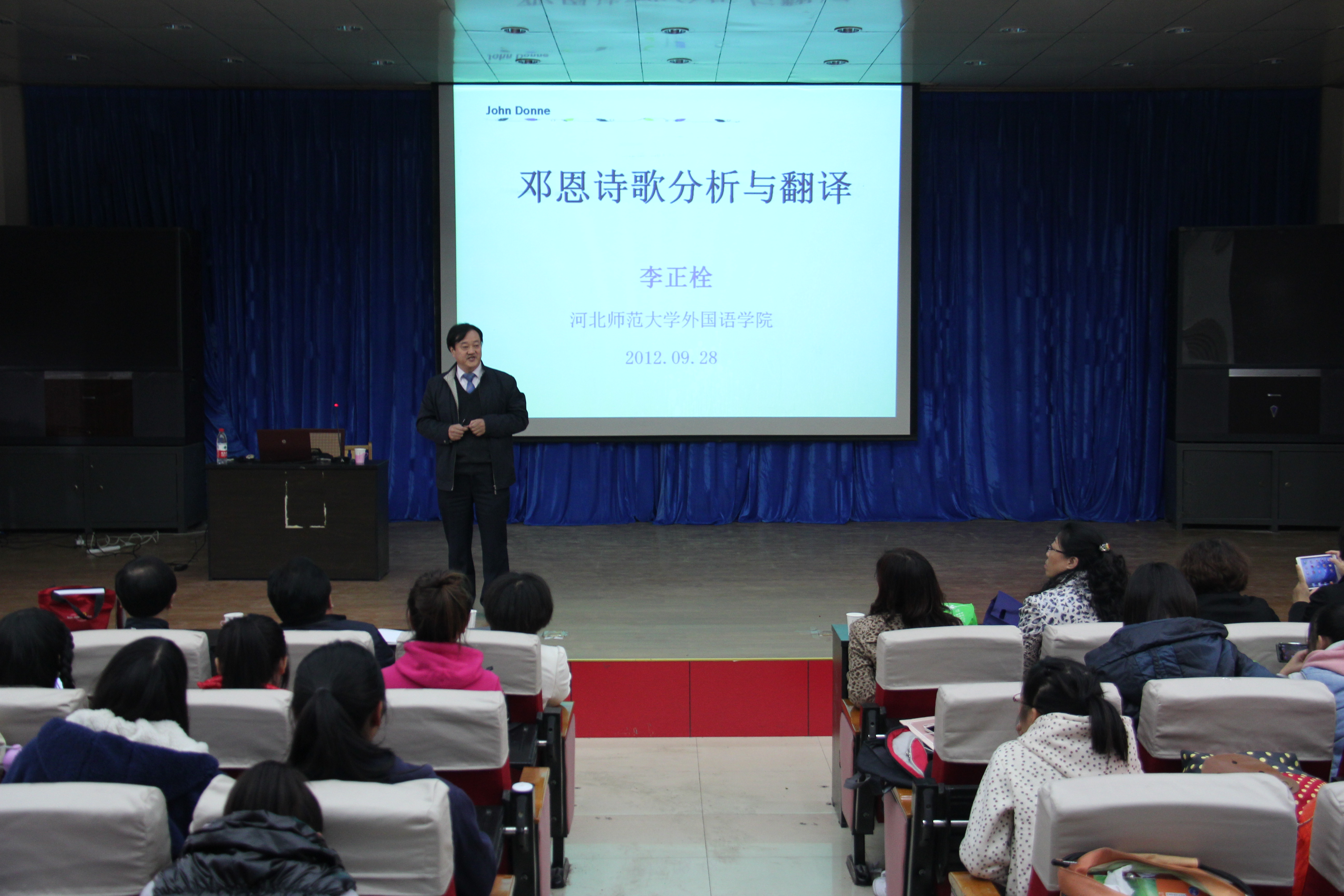 李正栓教授首先介绍了邓恩的生平以及创作诗歌的背景,然后用深入浅出、风趣幽默的语言讲解了“跳蚤”一诗的具体含义和深刻内涵。最后,李教授介绍了河北省的英语学科布局和考研专业设置情况,为即将考研和准备考研的学生指点迷津。