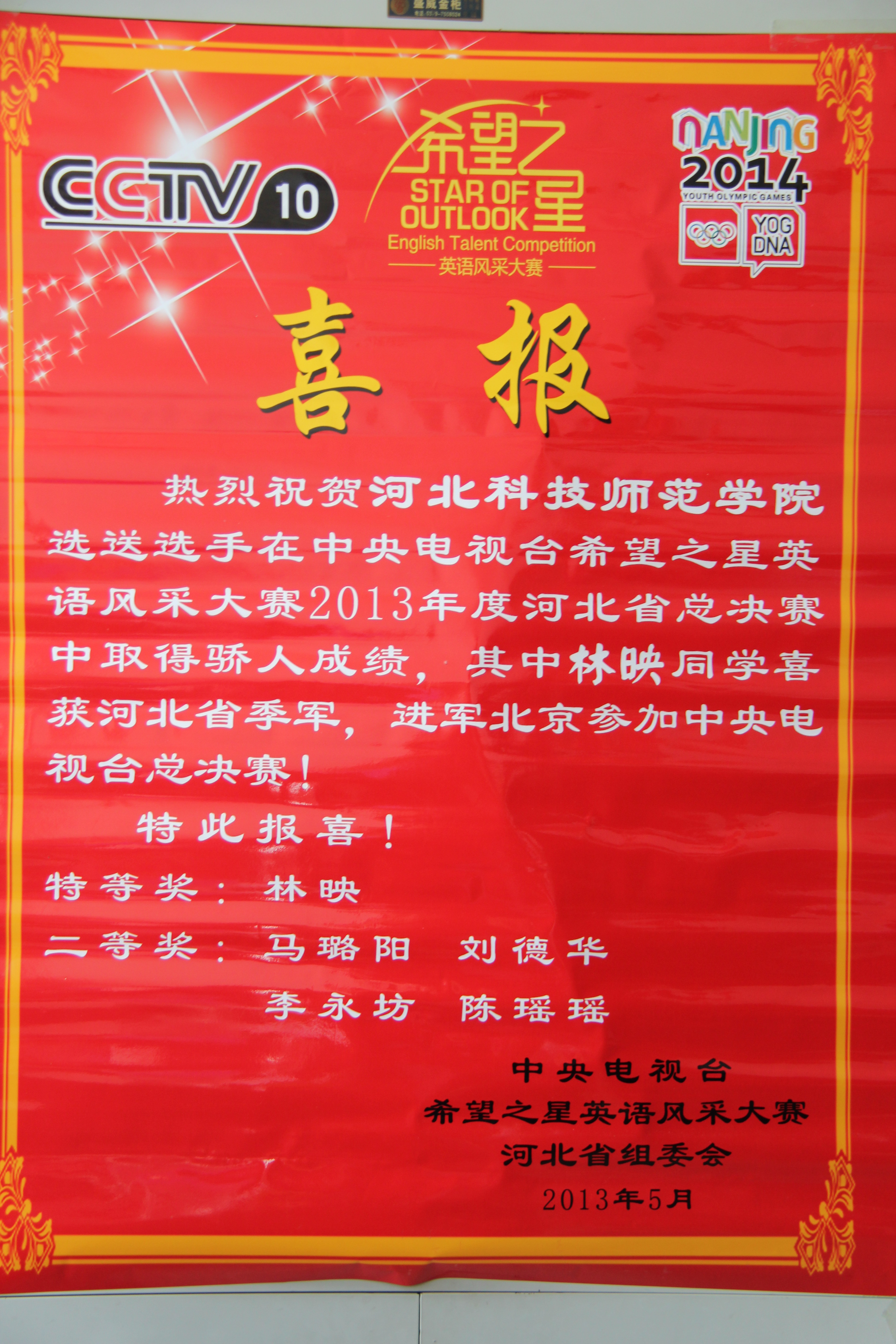 best365官网选手在河北省希望之星英语风采大赛总决赛中表现优异,其中best365手机版官方网站学生林映获得河北省季军,将进军北京中央电视台参加总决赛。另有马璐阳、刘德华、李永坊、陈瑶瑶四名同学获得二等奖。
