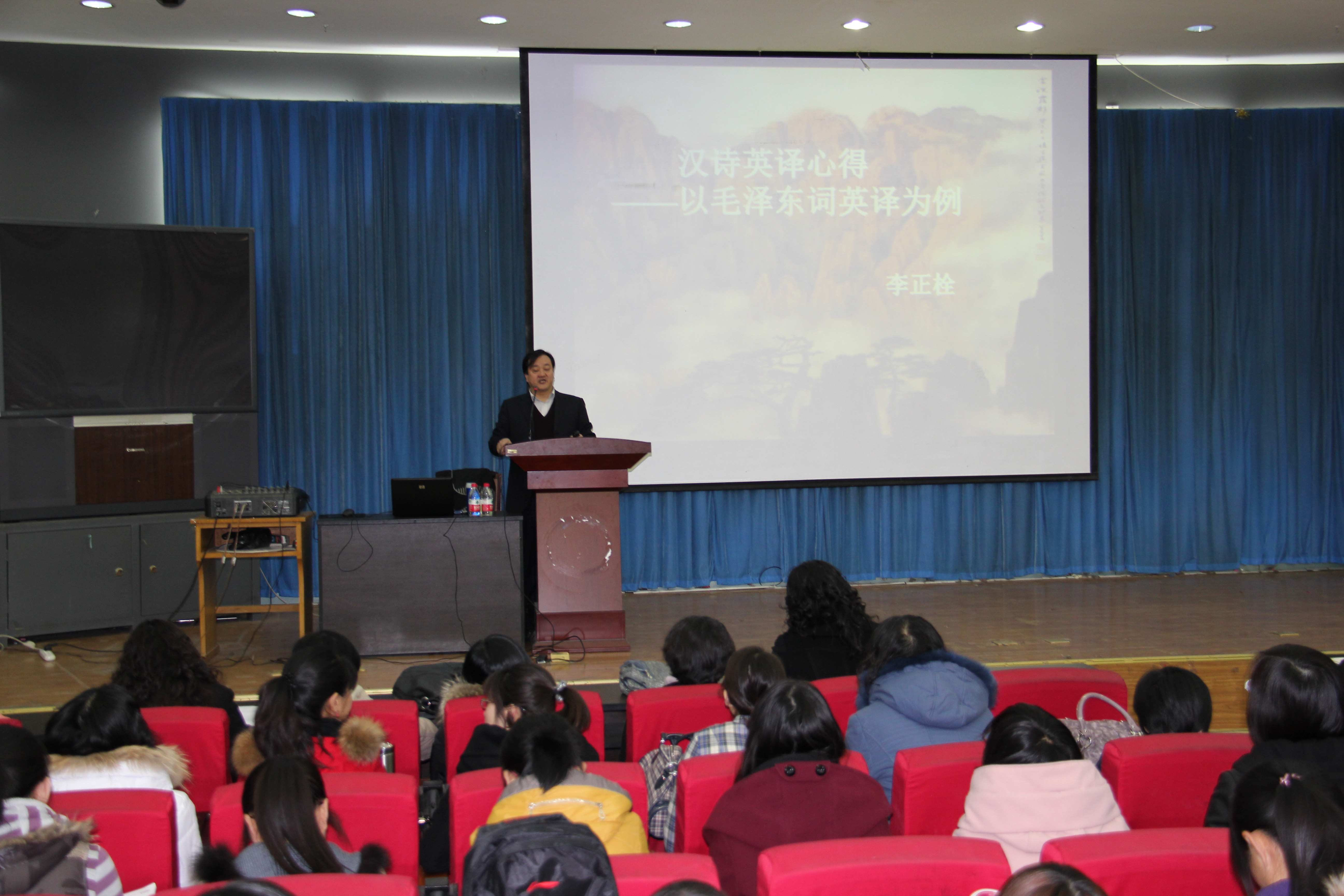 李正栓教授是河北省知名的中青年专家,是“河北省中青年社科专家五十人工程”人员。主要从事英美诗歌教学与研究、英汉诗互译及评论。此次报告,李教授正是以自己的研究专长为基础,结合毛泽东诗词,从专业翻译的角度,深入浅出地向广大师生讲解了在诗歌翻译过程中遇到的问题及翻译的技巧和方法。李教授声情并茂的朗诵、幽默的讲解无不深深地吸引了在场的师生,激发了学生学习英语的热情,增强了师生在诗歌翻译方面的兴趣。