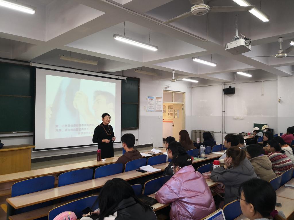 王老师是资深中学英语教师,从教36年,国家二级心理咨询师,海港区优秀教师,文明教师,感动港城“平民偶像”。王老师先是从班级活动讲起,如数家珍地向大家介绍了她自己班上的优秀学生和丰富多彩的班级活动。她的学生们个个积极向上,乐观开朗,班级学习气氛浓厚,学生的合作意识和团队荣誉感极强,孩子们敢想敢拼,获得了数不清的荣誉。正当听课学生慨叹为何王老师如此幸运时,她讲述了自己管理班级的秘诀——用爱育人、用心浇灌、追求卓越。王老师精通心理学方面的知识,在教书育人时,注意结合专业知识对学生进行心理辅导,对于有问题的孩子还进行心理干预。最后,王老师为2020级英语专业学生提出了自己的期望,鼓励学生们热爱教学、热爱育人,早日成为基础教育的中坚力量。