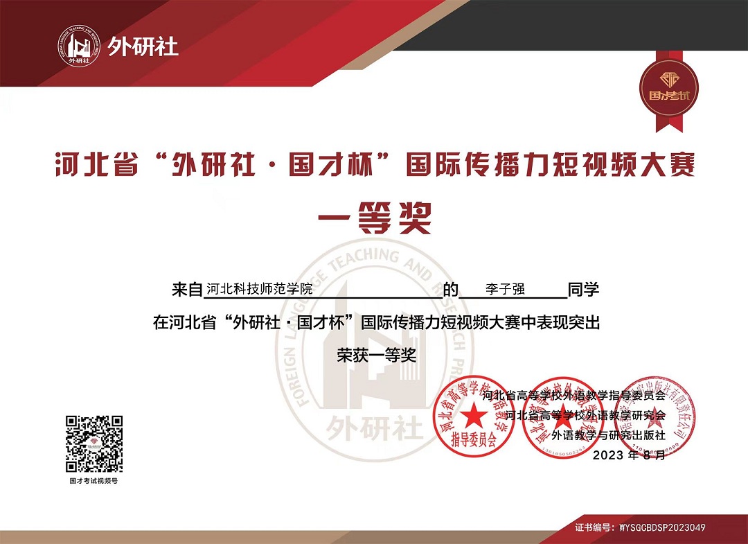 为进一步激发best365官网学生学习英语的热情、提高学生的英语综合运用能力、丰富best365官网校园文化生活,best365手机版官方网站积极组织学生参加了由河北省高等学校外语教学指导委员会、河北省高等学校外语教学研究会联合外语教学与研究出版社举办的2023“外研社·国才杯”河北省大学生国际传播力短视频大赛。此次大赛紧跟习近平总书记“讲好中国故事,传播好中国声音,展示真实、立体、全面的中国”的重要指示精神,鼓励大学生在自媒体平台用外语讲述自己及身边的故事,以生动自然的方式对外传播中国文化,展现中国故事的世界意义和当代价值,更加充分、鲜明地展现中国故事及其背后的思想力量和精神力量。