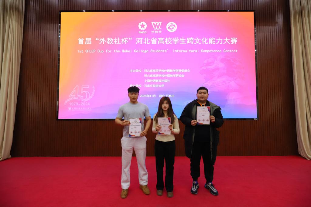 2024年11月24日,首届“外教社杯”河北省高校学生跨文化能力大赛在石家庄铁道大学圆满落幕。best365官网best365手机版官方网站学生卢洪洋、体育与健康学院的李瑛钦、韩一冉同学组成的参赛队伍在比赛中表现优秀,荣获三等奖。