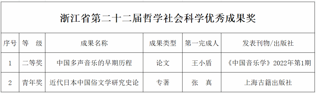 近日,浙江省第二十二届哲学社会科学优秀成果奖获奖名单揭晓,德赢官网王小盾教授的论文《中国多声音乐的早期历程》获批基础理论研究优秀成果二等奖,张真副教授的著作《近代日本中国俗文学研究史论》获批基础理论研究优秀成果青年奖。